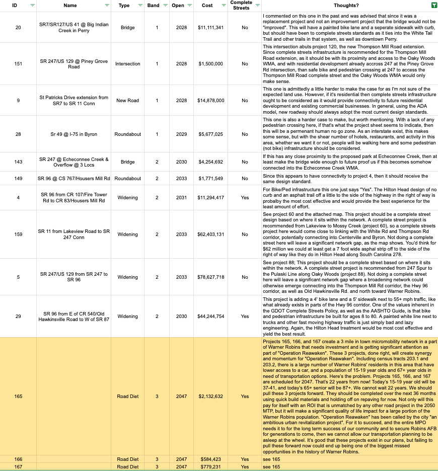 The commitment to complete streets is encouraging. One hundred percent of Band 3 (2040-2050) and 70 percent of Band 2 (2028-2039) projects have a “recommendation of bicycle/pedestrian infrastructure in accordance with GDOT’s Complete Streets Policy”. Zero percent of Band 1 (2026-2027) projects adopt complete streets, however.